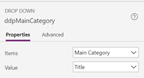 - Select the Items property of the first drop-down (ddpMainCategory in the example)