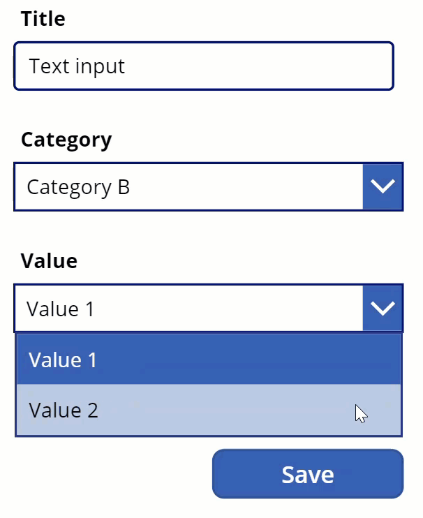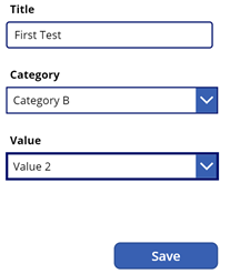In the SharePoint list, we only have the Title, and Type Value, and the values are now read from a different SharePoint list. Therefore we didn’t use a Power Apps form element where we have the SubmitForm action available. To save the details from our custom form, we need to use the Patch command. Add the following command to the OnSelect -event of the Save button. Again, remember to comment your code. It helps. I’ll promise