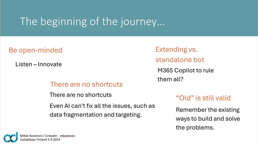 A few days ago, I had an opportunity to discuss and present some of my learnings and understanding of extending the M365 Copilot at the CollabDays Helsinki Event in a breakout session about ‘Copilot extensions & their possibilities.’ I will hold a few more deep-diving sessions in the upcoming months.