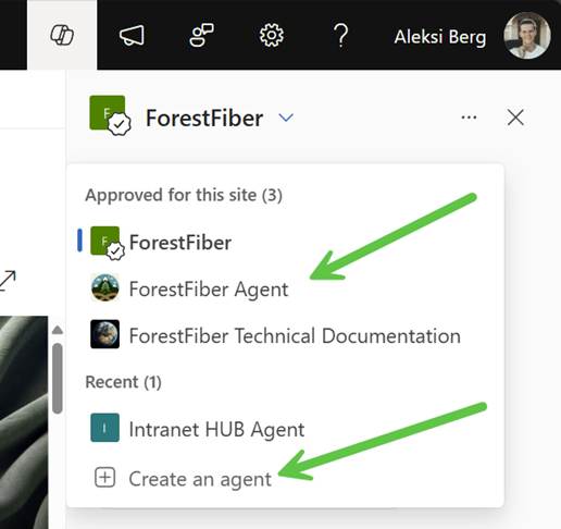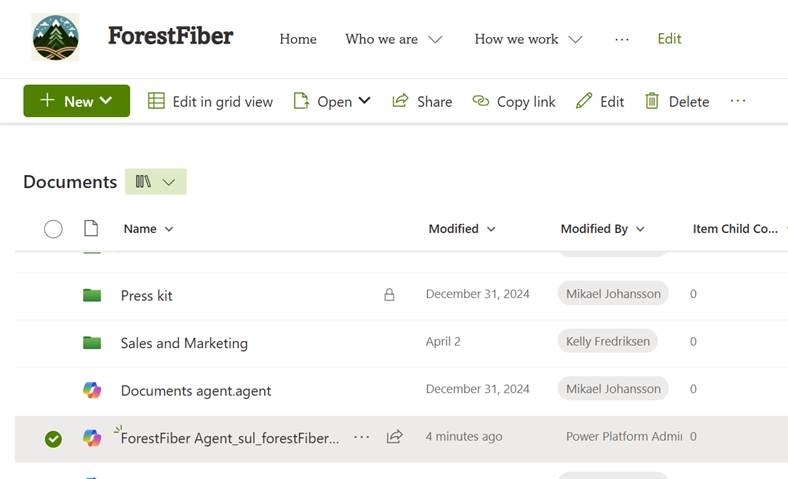 Publishing creates a .agent file into the site’s Shared Document library. You can open the agent from there, and after a while, it will also be added to the Copilot menu in the top right corner.