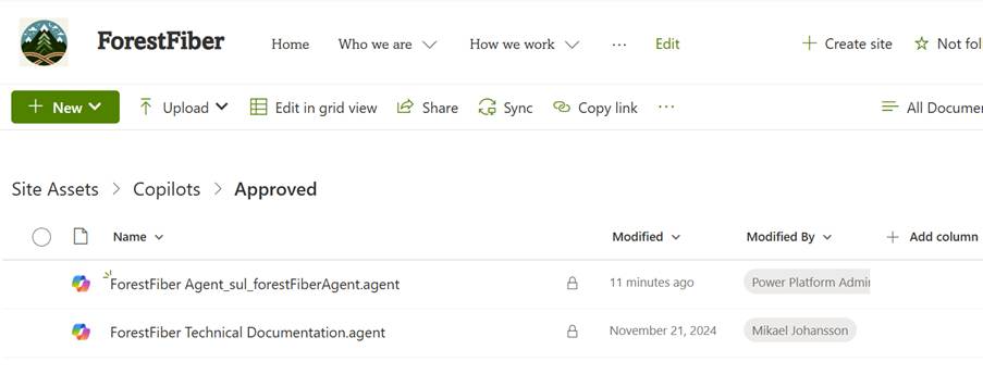 But note that when the agent is approved, its .agent files are moved under the Site Assets library, where all the basic site-level agents can be found. If you want, this custom engine agent can also be set as the default SharePoint Agent for the site.