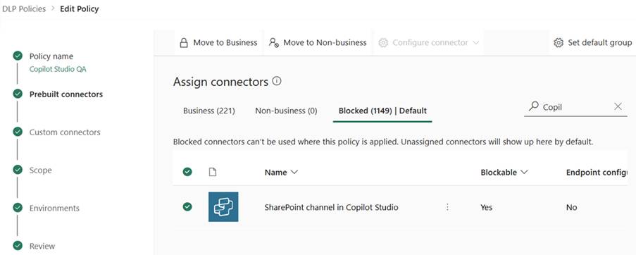 You can block or set the connector in the DLP policy level as desired. The setting is new, so remember to check the current group for the SharePoint channel in the Copilot Studio connector. I had it in the blocked phase before making the update.