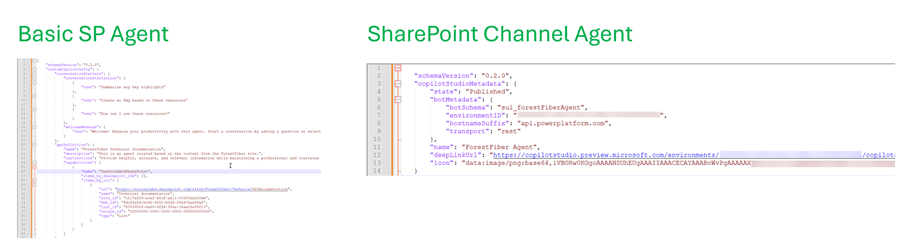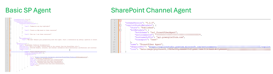 However, this agent is not the same type as the standard SharePoint agents. The file is only a reference to the actual agent in the Power Platform environment. Below, you can see the difference from the opened .agent files.