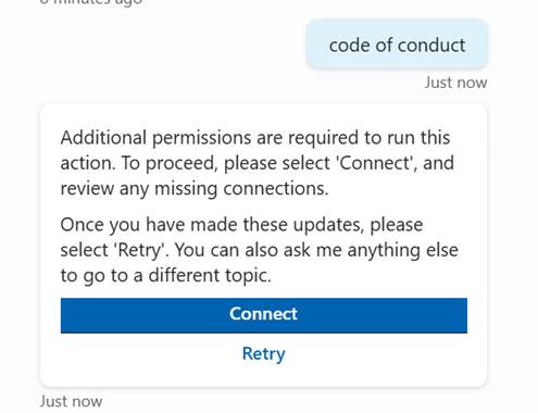 - When the user starts to use the knowledge source through the agent, they will see a warning and a request to create a new connection.