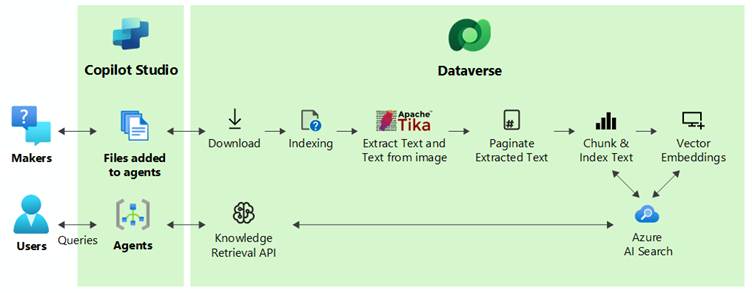 To improve the agent’s responses, uploaded files are chunked into pieces for faster processing and vector-indexed to provide semantic matches with the user’s query. The files are stored securely in Dataverse. When a user queries through an agent, Copilot Studio identifies the most relevant chunks that match the user’s query intent and returns the results to the user.