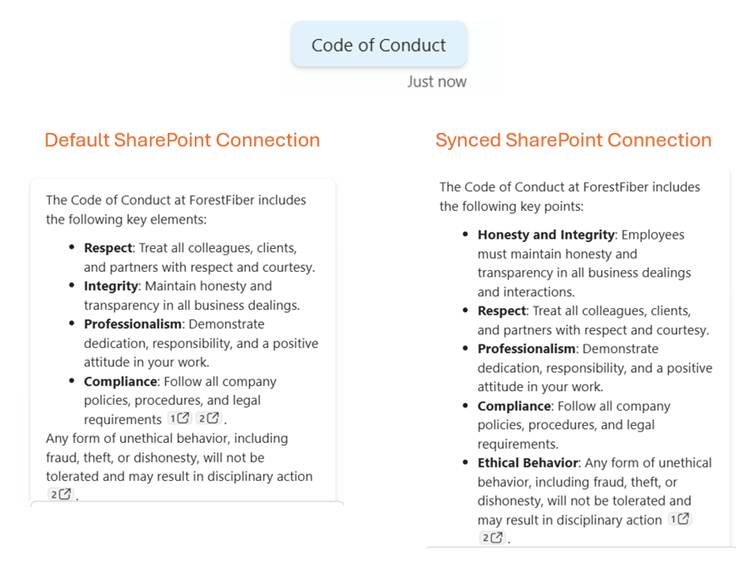 In the image above, you can see two different kinds of answers for the same question based on the same documents in SharePoint. As you can see, the synced files provide a better-quality answer.