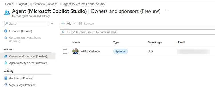 Entra service will offer the tools and capabilities to maintain business ownership, sponsoring details, and workflows. With Entra Agent ID, agents become fully governable identities within the tenant. You can require sponsors before an agent is published, apply conditional access policies directly to the agent, and clearly define ownership and responsibility. If needed, an agent can be disabled without impacting any user accounts.