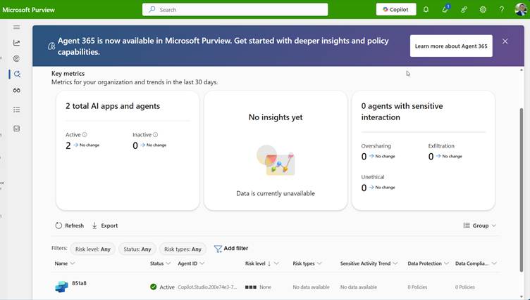 Many agents read SharePoint content, interact with Dataverse, summarize internal documents, and combine data from multiple sources. This creates a genuine risk of unintentional oversharing at scale. Traditional DLP policies designed for apps do not fully cover these scenarios, but Purview’s visibility into agent activity helps close that gap.