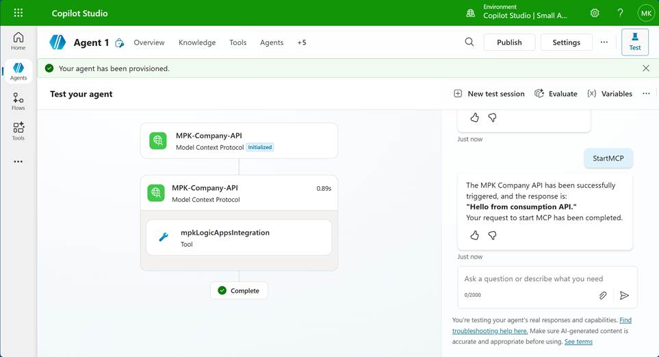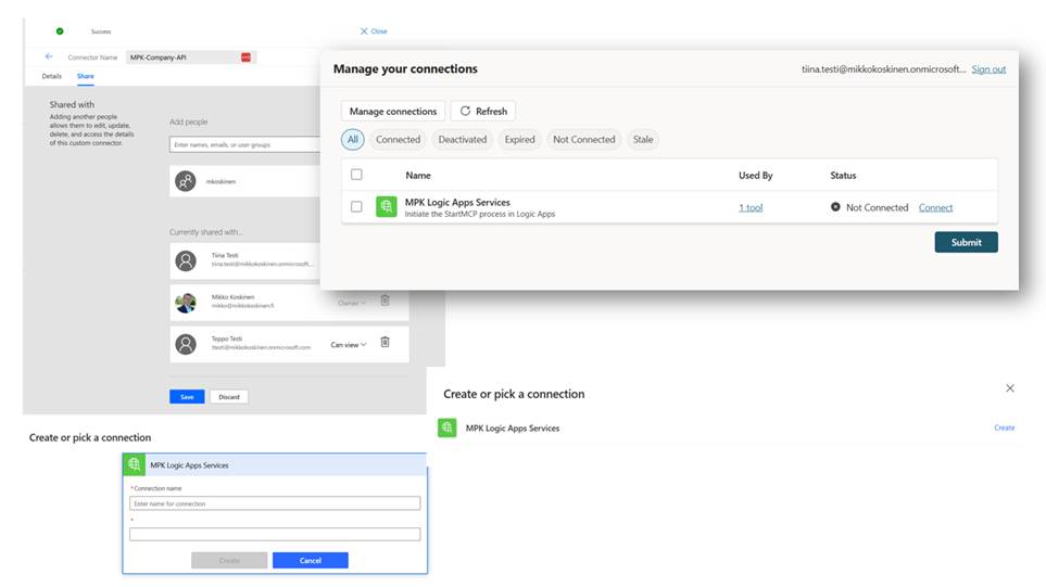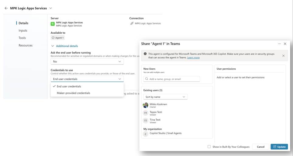 The easiest way to handle the MCP connection is to use the Maker-provided credential. In this case, you only need to share the agent and send the link; they can use the agent to call the MCP server functionality. For the end user, this is also easy, because they don’t need to create their own MCP connection; the connection and permissions between MCP and Logic Apps are handled by the creator’s account, which might not be optimal.