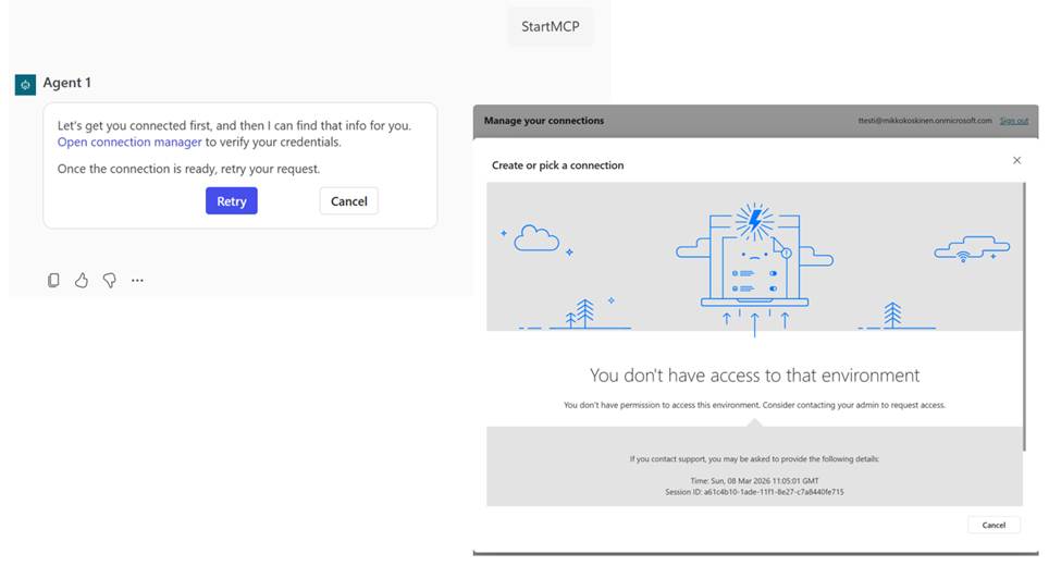 The reason is that the MCP Server connection is actually made through a PP environment-level custom connector. In this situation the end user doesn’t have access to this connector. So, the administrator needs to grant View permissions to the custom connector in the end user’s environment.