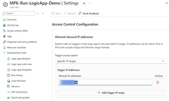In the Logic Apps portal, you set up the desired IP address in the Settings section. Note: the IP address is given in xx.xx.xx.xxx/32 format.