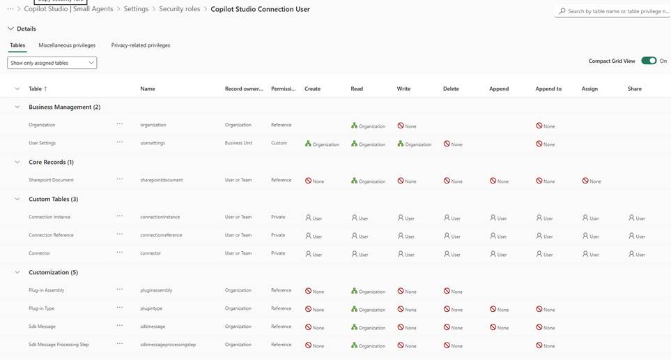 I decided to create a custom Dataverse Security role “Copilot Studio Connection User” from scratch. Create or edit a security role to manage access – Power Platform | Microsoft Learn. In the role you need to give access to: