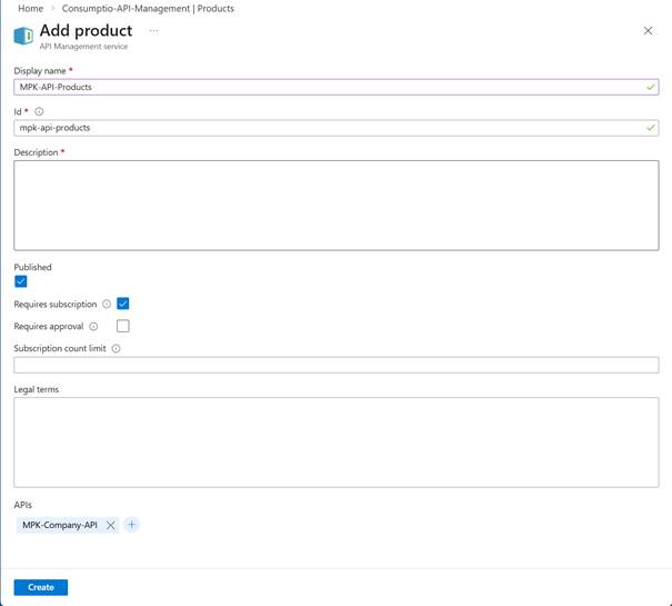 - Create a subscription key for the product to be used as a basic security mechanism for the connection