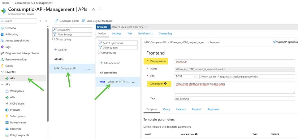 - Select APIs from the left menu -> select desired API -> select the operation -> Click edit for the Frontend definitions