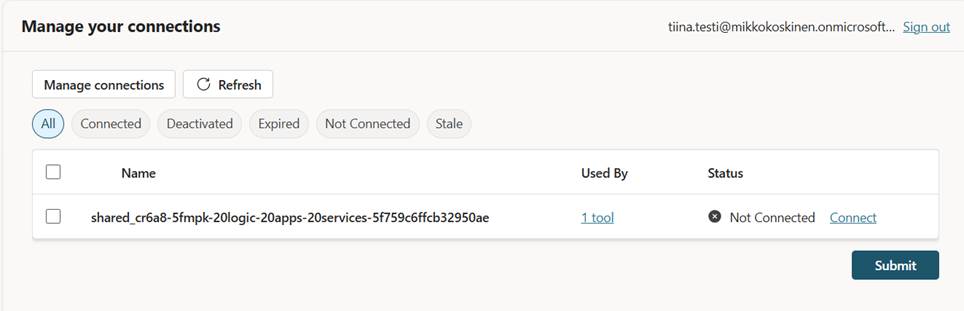 First, let’s update the MCP Server Tool credentials to use end-user credentials. When the user opens the published agent, they will be notified to create a new connection. But when the user opens the Connection Manager, they will end up in an error page.