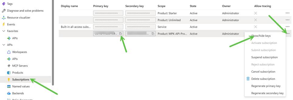- This key can be found from API Management: Subscription from the left menu -> open menu and show keys -> copy the desired key.