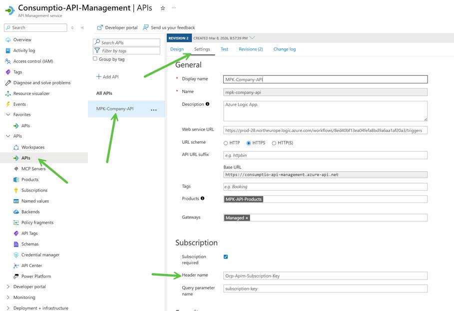 There are two types of Keys to use: Header and Query. Enter the name of the header or query parameter where the API key should be included. Note: You can get and set up the parameters in the API Management Settings: APIs from the left menu -> Select API -> Settings -> Subscription section.